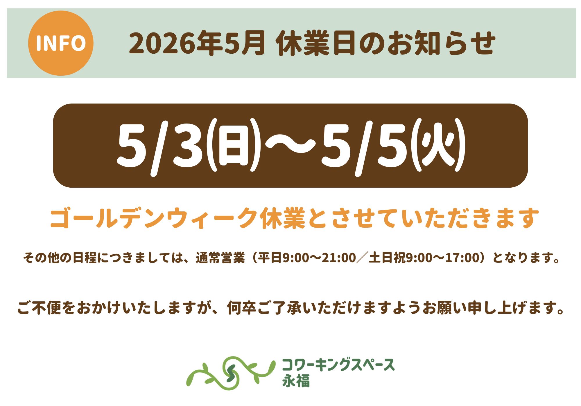 【5月3日(日)〜5月5日(火)】 GW休業とさせていただきます 平素よりコワーキングスペース永福をご利用いただきありがとうございます。 以下の日程をゴールデンウイークの休業日とさせていただくことにな …